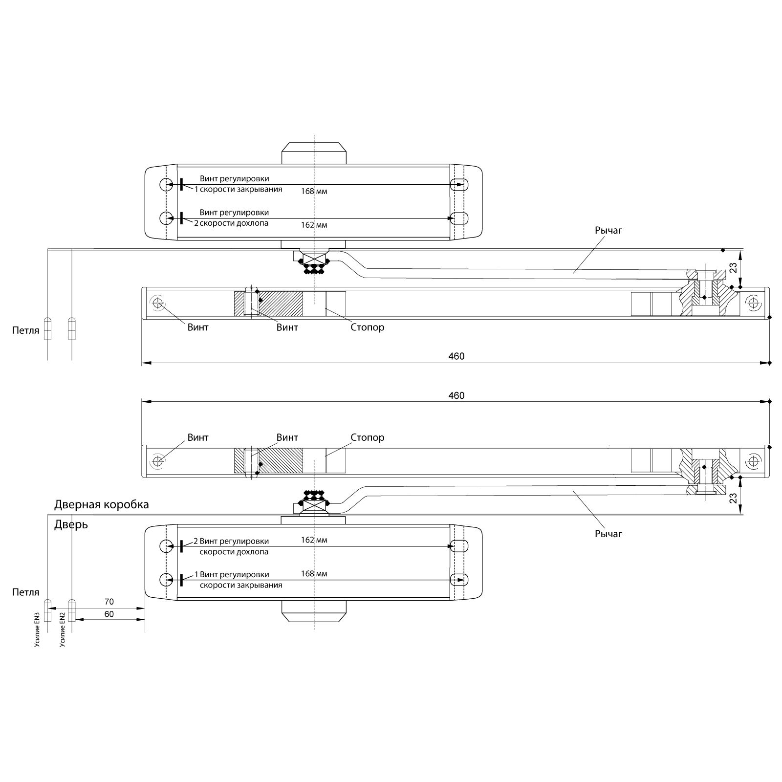 Дверные доводчики «БУЛАТ», предназначены для плавного, автоматического закрытия двери. Подходит для большинства пластиковых, деревянных и металлических дверей. Устанавливаются в квартирах, офисах, промышленных и других помещениях. Функции: регулируемая скорость закрывания двери, регулируемая скорость окончательной доводки, функция фиксация двери в открытом положении. Универсальный установочный размер в серии легких доводчиков (162-168 мм ) за счет овальных отверстий в корпусе. Модель подходит для дверей весом весом 40-90 кг при угле открывания до 160°. Температурный диапазон работы от -49 до +55 С. Комплект поставки Дверной доводчик Рычаг со скользящей тягой Крепеж Инструкция по монтажу и эксплуатации, совмещенная с паспортом изделия