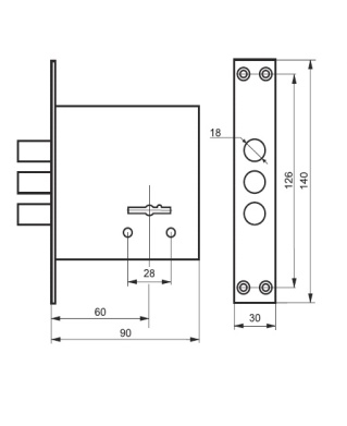 Замок врезной "Верхний 3014C-3P" 3 круглых ригеля d-18мм, сувальдный (YS-776-30мм) (4 крепотверстия)