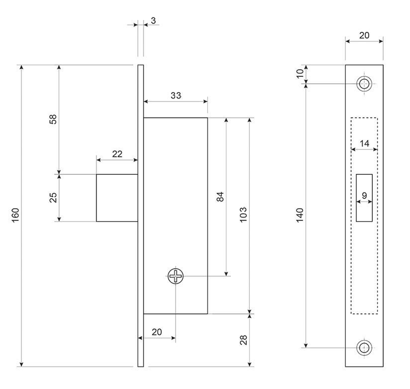 Габариты корпуса: 33х103мм, торц. планка - 160х20мм. Удаление ключевого отверстия (Backset)-20 мм. Крестообразный ключ. Цвет - хром