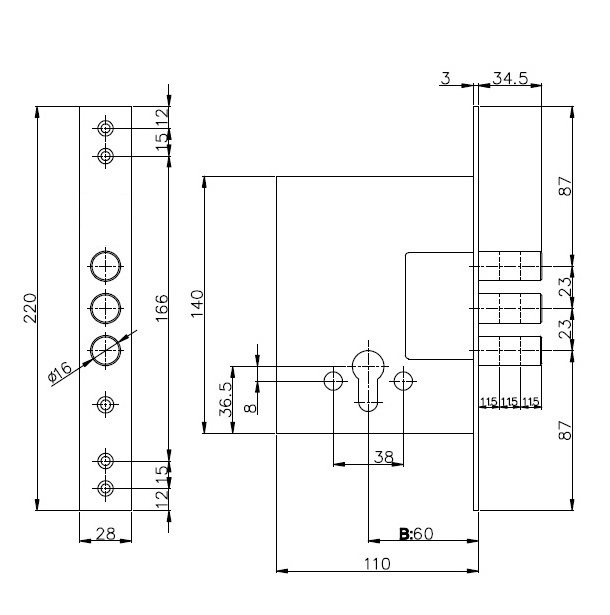 Ширина торцевой планки 28мм. Запирательный механизм оснащён 3-мя ригелями. Диаметр ригеля d-16мм.