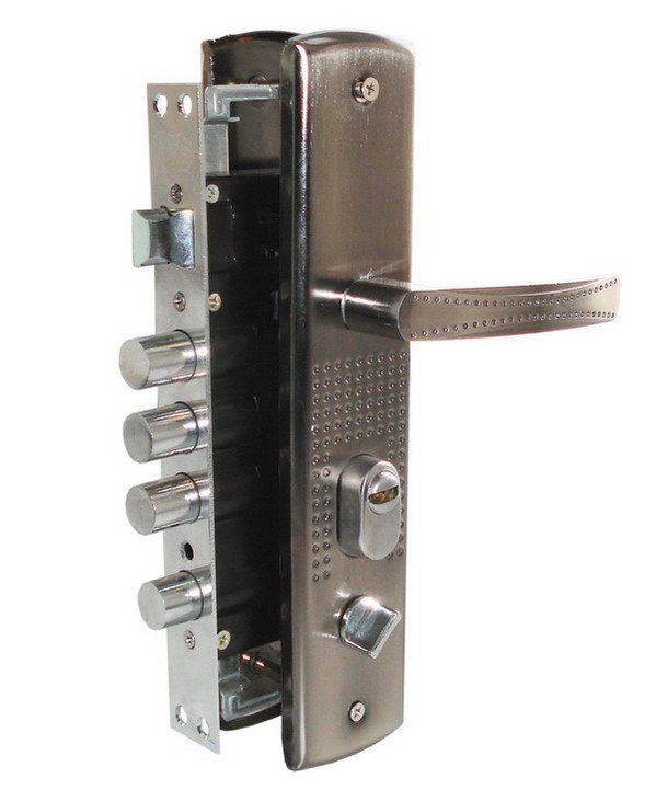 Замок с защелкой, задвижкой, тягами для запорного устройства и защитной накладкой на цилиндр.
