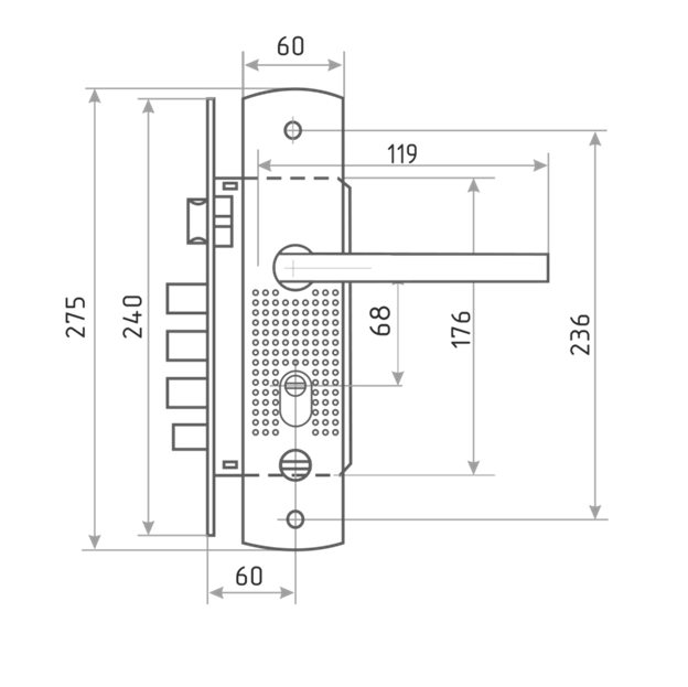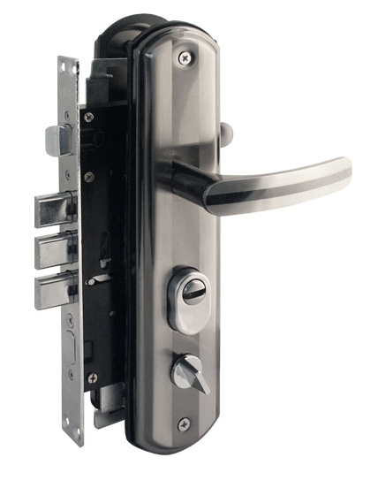 Замок с защелкой, задвижкой, тягами для запорного устройства и защитной накладкой на цилиндр.
