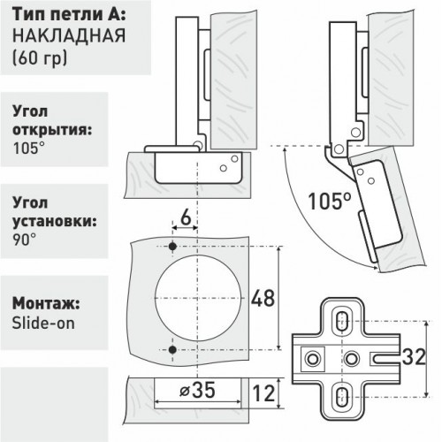 Петля мебельная накладная slide-on SOLLER 60 гр.