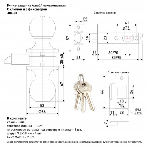 Ручка-защелка /кноб/ межкомнатная SOLLER ЗШ-01 хром с ключом и фиксатором