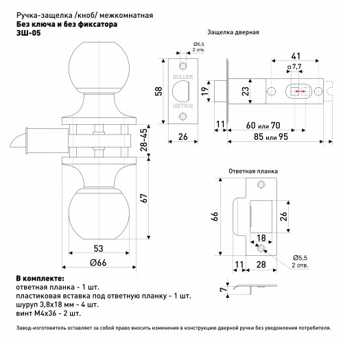 Ручка-защелка /кноб/ межкомнатная SOLLER ЗШ-05 BKPS CP хром без ключа и фиксатора