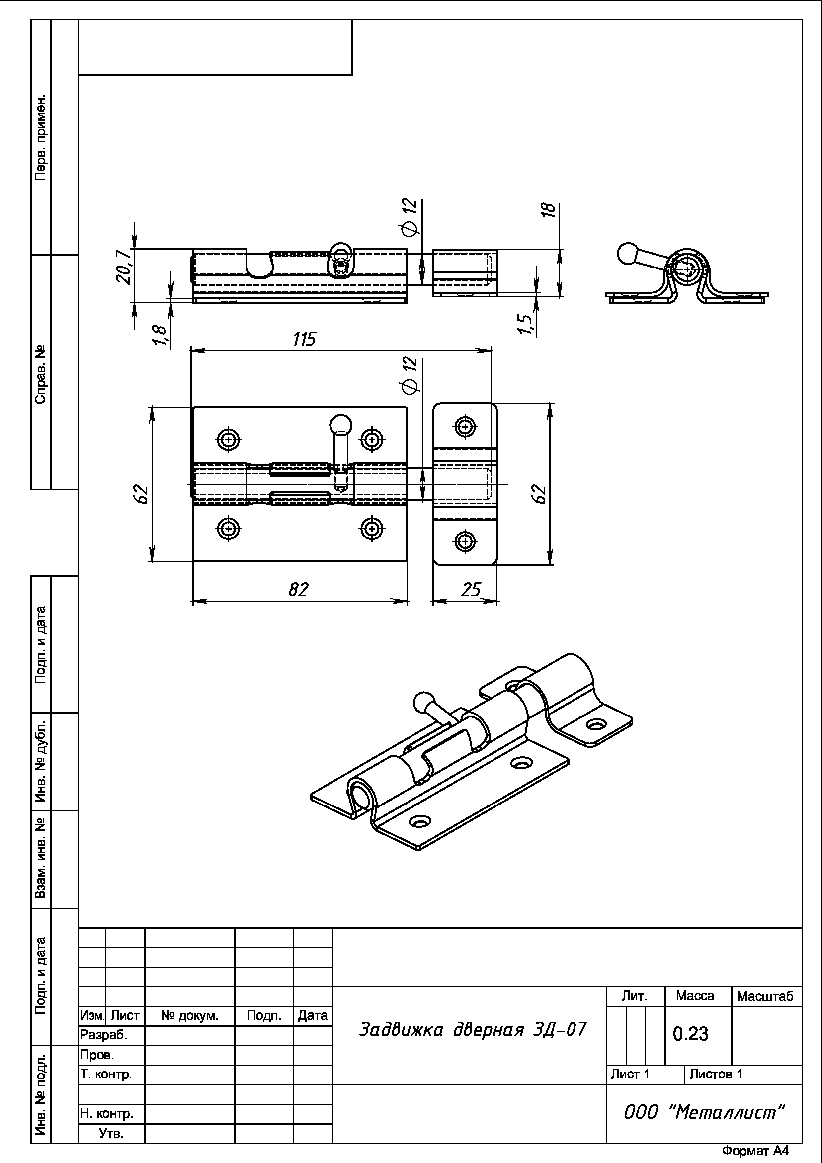 Задвижка дверная ЗД-07 L-115мм, бронза (М-К)