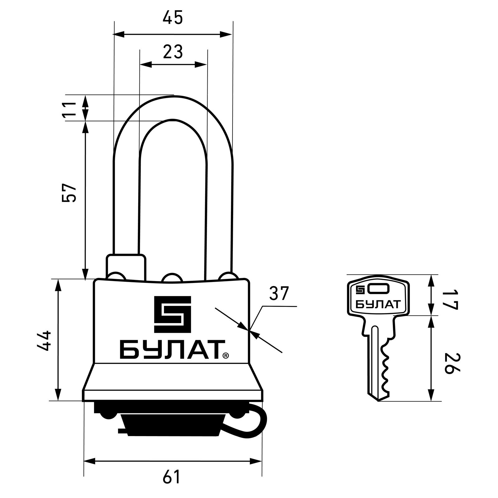 Замок навесной «БУЛАТ» предназначен для запирания, распределительных щитов, почтовых ящиков, гаражей, складов, подвалов и прочих помещений. Пластиковый кожух защищает замок от внешнего воздействия окружающей среды. Замок обладает длительным сроком эксплуатации. Гарантийный срок 5 лет с момента продажи через розничную сеть. Размер корпуса: 62х48х37 мм Диаметр дужки: 11 мм Проем дужки по высоте: 57 мм Проем дужки по ширине: 23 мм