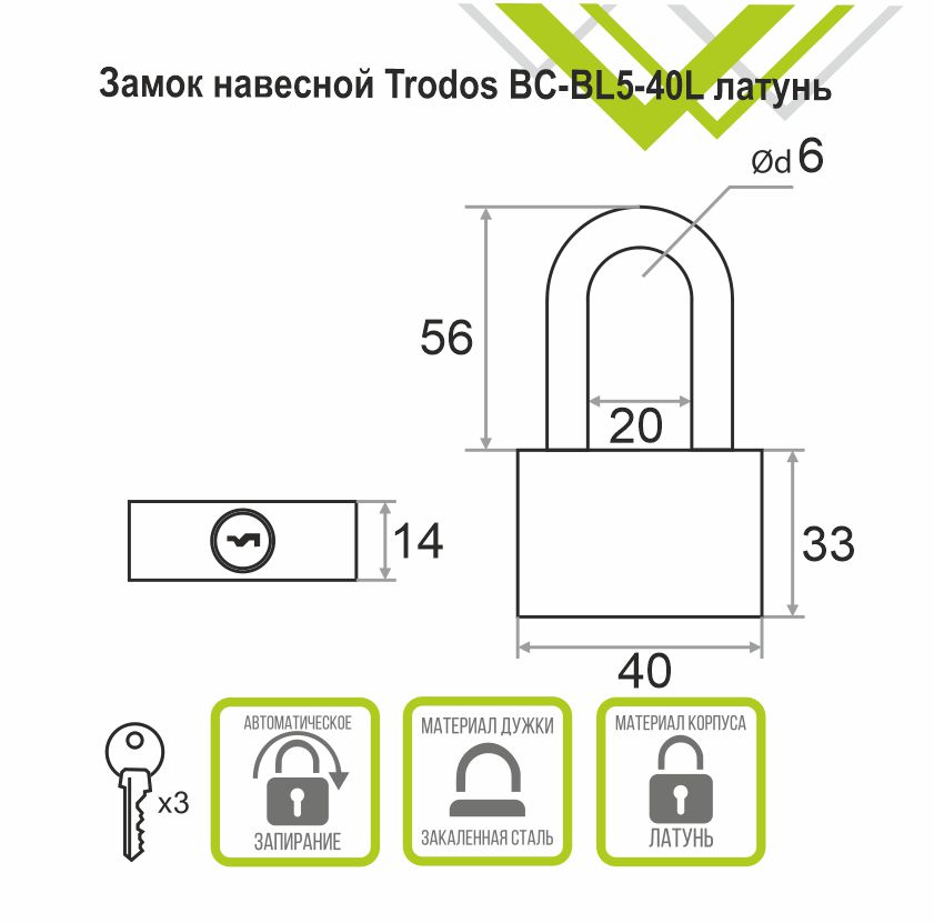 Замок навесной Trodos BC-BL5-40L латунь