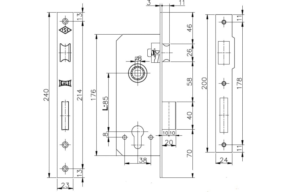 Замок врезной цилиндровый для деревянных дверей KALE KILIT 152R,85BS45,23BP,w/o SP,w/o Ros,STB(золот