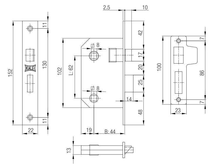Замок врезной межкомнатный KALE KILIT 251 WC для деревянных дверей,62BS44,22BP,R,SP,STB (правый)