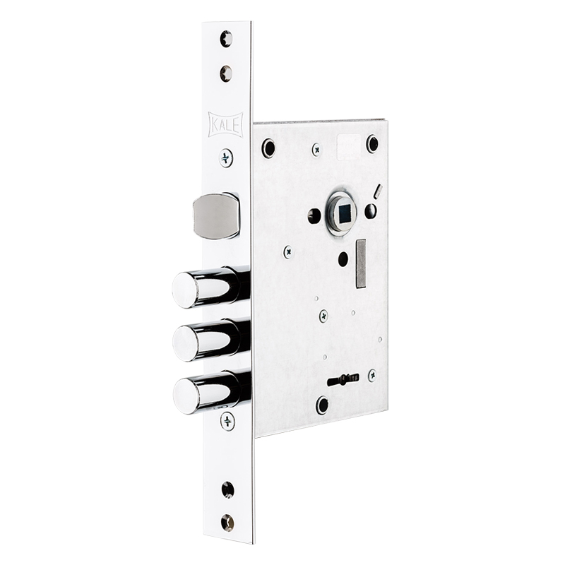 С переустанавливаемой защелкой диаметром 18 мм, без задвижки, с прямоугольной лицевой планкой 3 мм, с круглыми ригелями (3 шт) диаметром 16 мм и вылетом в 2 оборота на 26 мм, без тяг, без подшипника, с отверстием под ручки 8х8 мм (межосевое расстояние 85 мм), с бэксетом 65 мм, без ответной планки, без декоративных накладок на ключевину, с каленой бронепластиной пластиной, с КОРОТКИМИ ключами (4 шт.), 3 класса взломостойкости. Лицевая планка хромированная.
