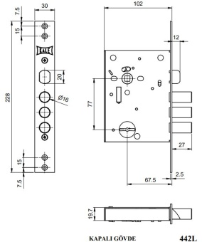 Замок врезной сувальдный KALE KILIT 442L,77BS67,5,30CP,4K(60mm),w/o SP,w/o Ros,PB