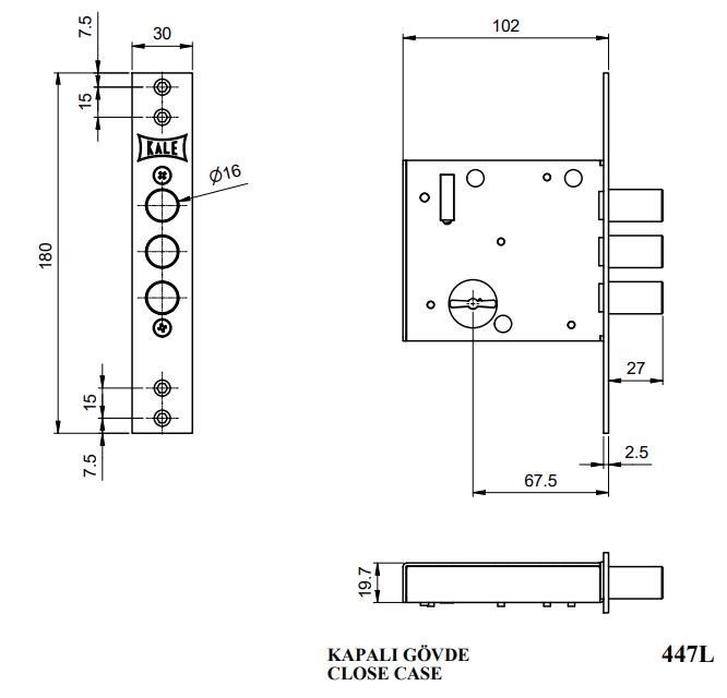 Замок врезной сувальдный KALE KILIT 447L,BS67,5,30CP,4K(60mm),w/o SP,w/o Ros,PB
