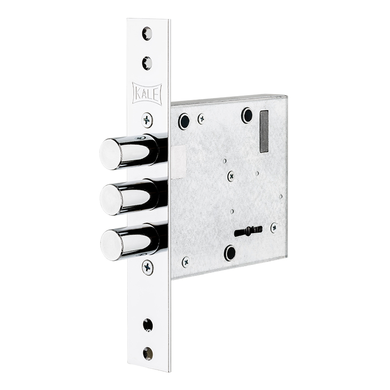 Замок врезной сувальдный универсальный Kale Kilit 447L для металлических дверей. Без защелки и задвижки, с прямоугольной лицевой планкой 3 мм, с круглыми ригелями (3 шт) диаметром 16 мм и вылетом в 2 оборота на 26 мм, без тяг, без подшипника, без отверстий под ручки, с бэксетом 65 мм, без ответной планки, без декоративных накладок на ключевину, с КОРОТКИМИ ключами (5 шт.),