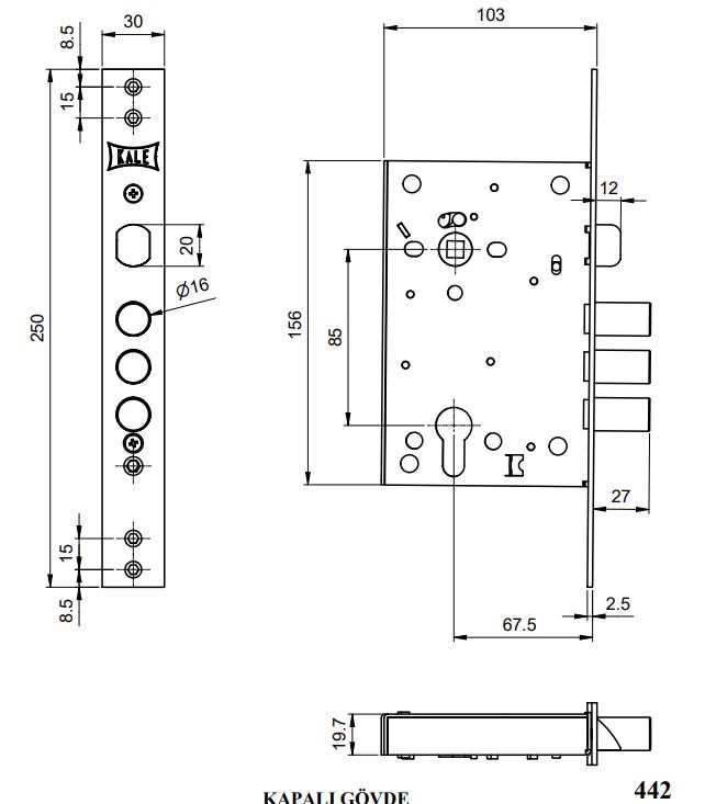 Замок врезной цилиндровый KALE KILIT 442,85BS67,5,30CP,w/o SP, w/o Ros,PB