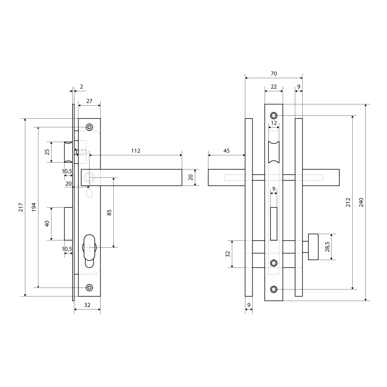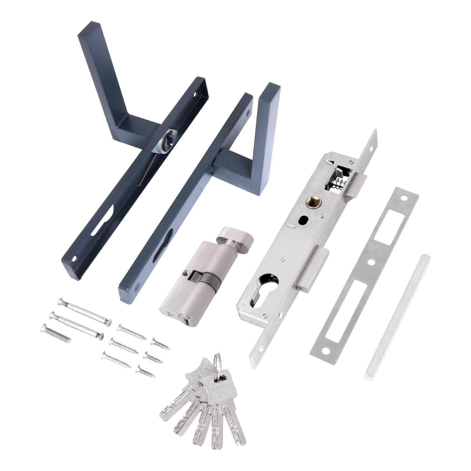 Замок врезной с ручками. Предназначен для установки в калиточные двери, правого и левого открывания.Возможна установка в деревянные двери, а так же двери из алюминиевого профиля. Дверь может быть закрыта на защелку и открыта с помощью фалевой ручки при открытом засове замка. Универсальная защелка. Корпус и торцевая планка из нержавеющей стали. Межосевое расстояние 85мм. Удаление ключевого отверстия 20мм. Ручки с полимерным покрытием по каталогу RAL. Материал - сталь. Механизм секрета с перфоключом, длина 70 мм, 5 ключей. Материал - цинковый сплав.