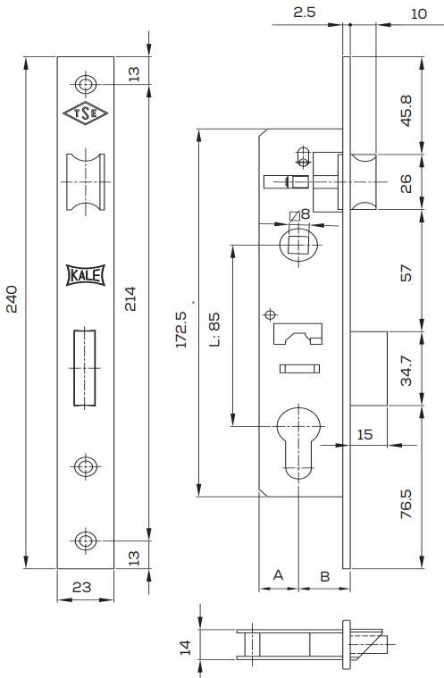 Замок врезной цилиндровый узкопрофильный KALE KILIT 153,85BS35,23NP,w/o SP,w/o Ros,STB
