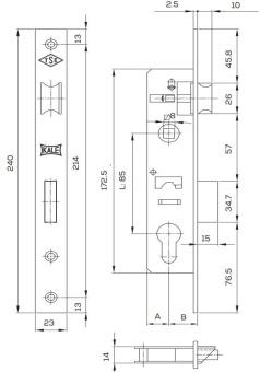 Замок врезной цилиндровый узкопрофильный KALE KILIT 153,85BS20,23NP,w/o SP,w/o Ros,STB