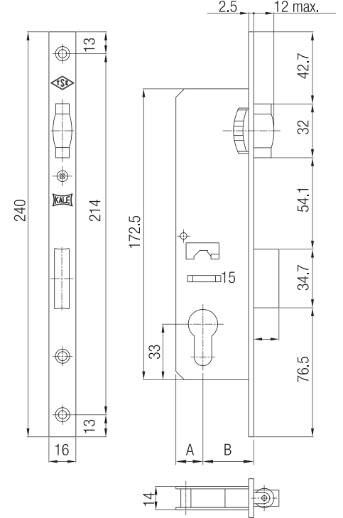 Замок врезной цилиндровый узкопрофильный KALE KILIT 155P,BS25,R,16CP,w/o SP,w/o Ros,STB